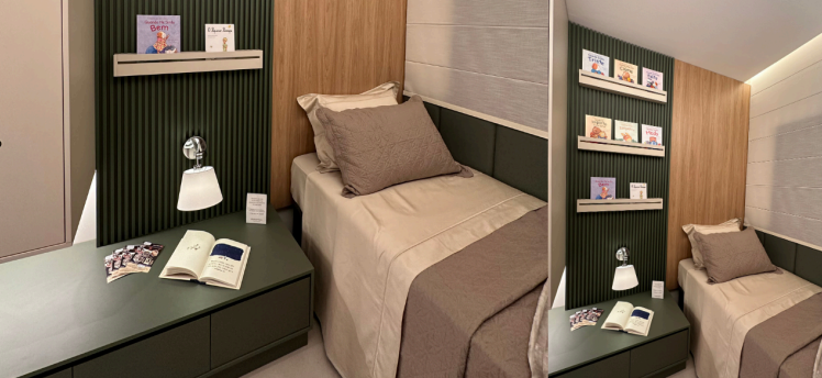 O hábito da leitura começa no espaço. A cabeceira com nichos para livros